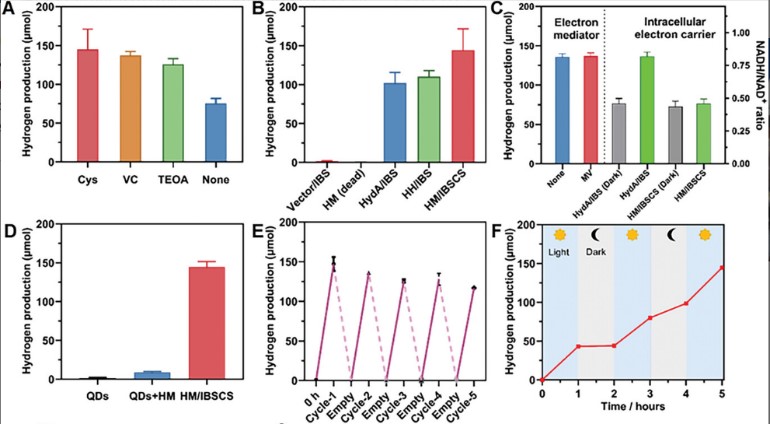 研究中,通过基因工程技术将重组氢化酶(HydA)和丝素蛋白(MaSpI8/IDPs)融合蛋白(HM)与量子点(Quantum Dots, QDs)共组装,形成无机-生物亚细胞混合系统(Inorganic-Biological Subcellular Compartments Hybrid System, IBSCS)。该系统在细胞内形成特定的亚细胞区室,促进了高效的电子传递和光能利用,显著提高了氢气产生效率。实验结果表明,光激发的电子直接转移到氢化酶,减少了电子与空穴的复合,提高了光合作用效率。