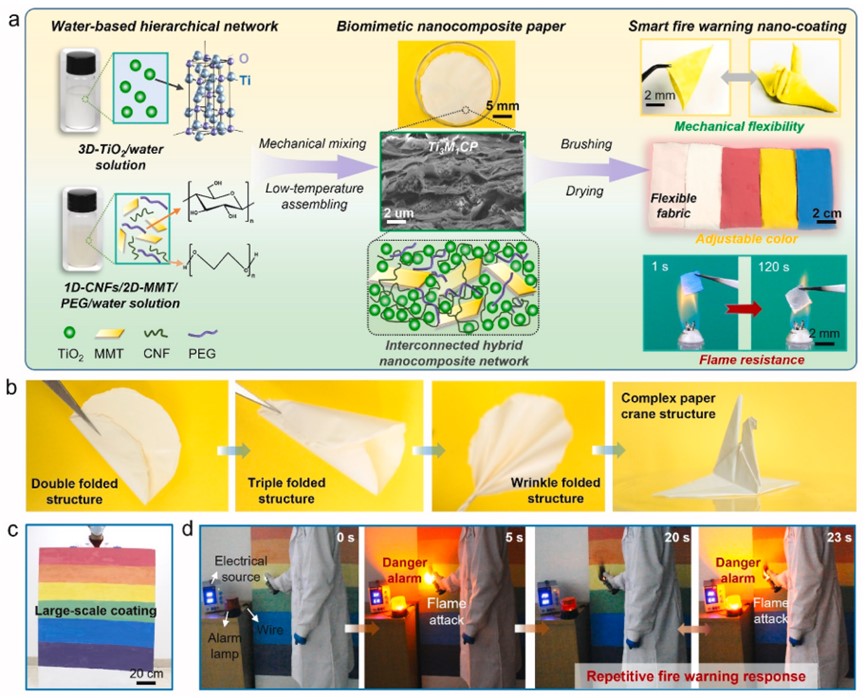 近日,重庆时时彩 汤龙程教授团队报道了一种绿色、经济高效的大规模制备水基3D-二氧化钛/2D-蒙脱石/1D-纤维素纳米纤维(TiO2/MMT/CNF)纳米复合涂层的策略,通过简单的机械共混法和低温诱导自组装法,提供了一种具有主动火灾预警和被动阻燃防护的绿色纳米复合涂料。在本研究中,TiO2网络可为暴露于火焰后价带(VB)和导带(CB)之间的电阻跃迁提供火灾警报信号,无机MMT填料可以提高网络的阻燃性和结构稳定性,而纤维素和PEG分子的加入可以得到具有良好机械性能的自支撑纸,该TiO2/MMT/CNF交联网络在刚性木材和软质织物基材上表现出可调节的颜色、良好的机械灵活性(折叠成千纸鹤形状)、出色的阻燃性能以及稳定的循环报警性能。