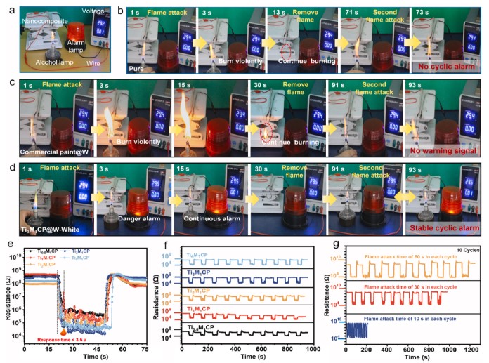 研究中,通过导线将Ti3M1CP纳米复合薄膜、报警灯和电源串联,形成一个简易的火灾报警传感器。与纯木材/涂有商业油漆的木材相比,该Ti3M1CP涂层不仅赋予木材优异的阻燃性,还提供了循环且灵敏的火灾报警能力。实验数据表明,TiO2/MMT/CNF交联网络不仅能实现快速(<3.5 s)的电阻转变,还能在不同时间的火焰攻击下维持稳定可重复的电阻变化循环。其中,相较于其他配比的薄膜, Ti3M1CP薄膜的响应时间最快。