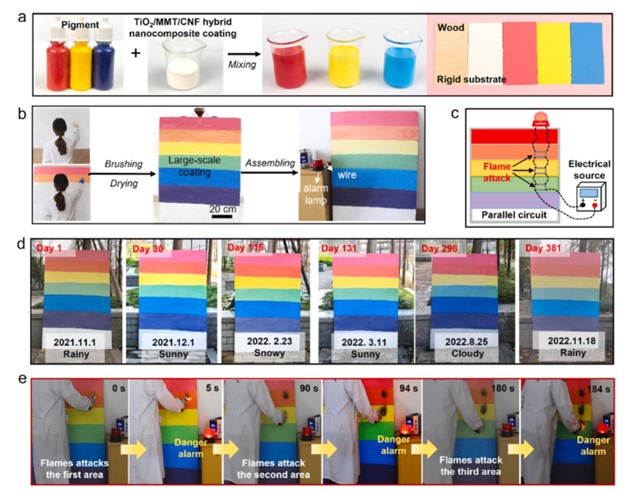 往涂料中引入红、黄、蓝三种颜色的颜料,经过硅烷改性处理即可获得具有颜色可调的TiO2基纳米复合涂料,且可进行大规模生产,得到大尺度样品。该大尺度木板不仅表现出优异的耐燃性,而且能够产生快速(<5 s)的火灾报警和重复的火灾报警响应。此外,颜色可调的大规模纳米复合涂层具有出色的环境可靠性,在室外曝晒一年后仍能保持原有颜色。更重要的是,这种硅烷处理的TiO2/MMT/CNF纳米复合涂层在各种复杂天气条件下暴露一年以上后,仍能保持敏感稳定的火灾循环报警响应,展示了可重复使用和耐候性的循环火灾报警响应,为潜在的户外应用提供了可能。
