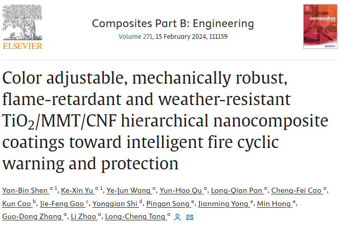 汤龙程教授团队在智能阻燃预警领域取得新进展,相关研究成果以题为“Color adjustable, mechanically robust, flame-retardant and weather-resistant TiO2/MMT/CNF hierarchical nanocomposite coatings toward intelligent fire cyclic warning and protection”发表于材料类一区期刊 Composites Part B: Engineering (IF=13.1)上。