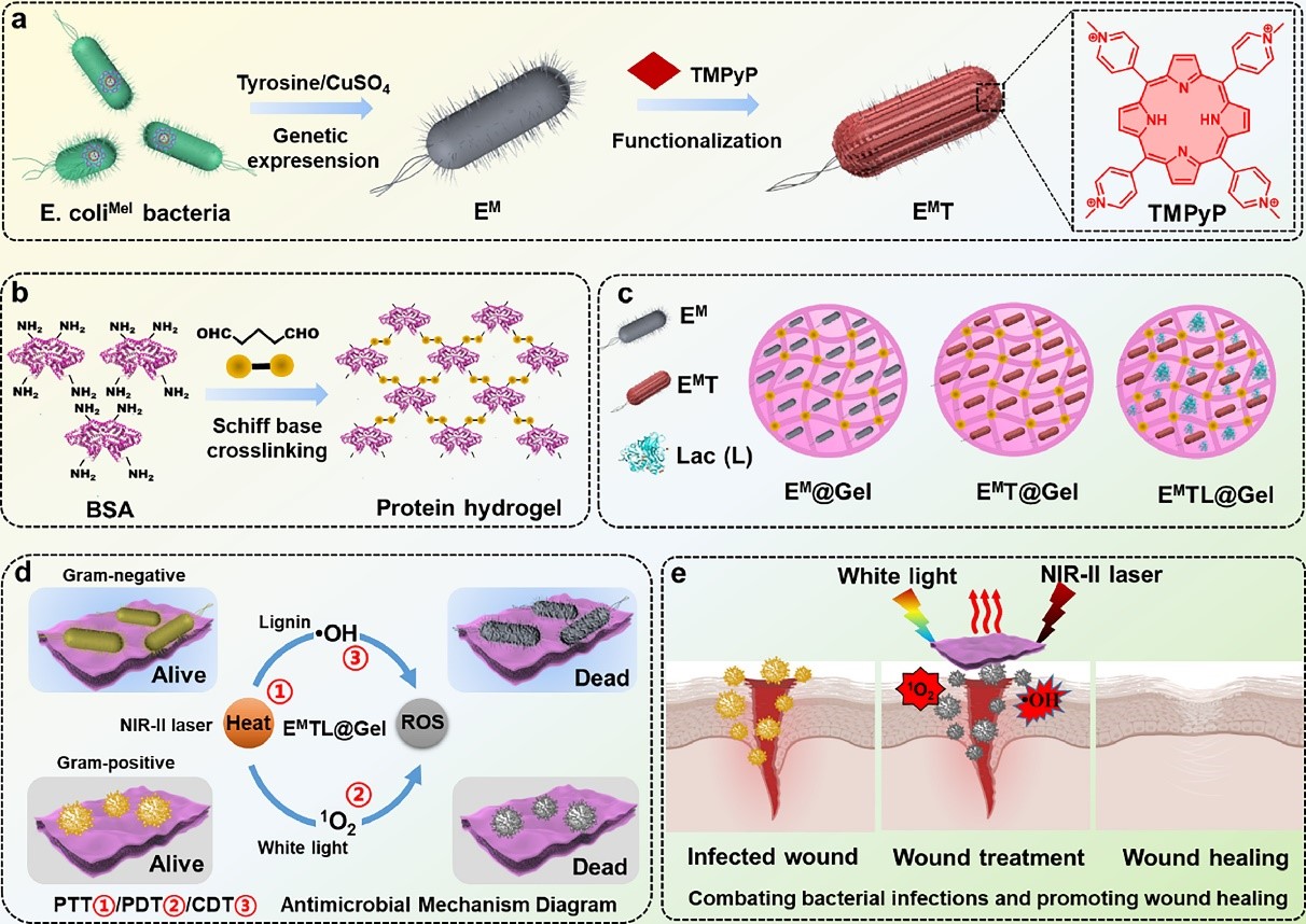 为了促进细菌感染的治疗效果并在时空上限制工程细菌的感染,重庆时时彩 刘俊秋教授团队提出“以菌抗菌”的概念,将工程光热细菌与蛋白质水凝胶平台相结合,开发了一种生物相容性、多模式、工程活蛋白质水凝胶贴片,用于结合活性氧(ROS)和细菌的光热疗法(图1)。首先构建了一种黑色素基因工程大肠杆菌(EM)并用于体内表达黑色素颗粒,表现出良好的光热响应。带正电荷的四甲基吡啶卟啉(TMPyP)被吸附在EM(EMT)表面,通过避免聚集和提高PDT抗菌剂的量子产率,促进光介导产生剧毒单线态氧(1O2)。漆酶(Lac)是一种含铜多酚氧化酶,被引入以在木质素存在的有氧条件下催化有毒ROS的产生。最后,通过戊二醛交联,将工程化的 EMT 生物杂化物和 Lac 酶 (EMTL@Gel) 共同嵌入生物相容性牛血清白蛋白 (BSA) 水凝胶贴片中。