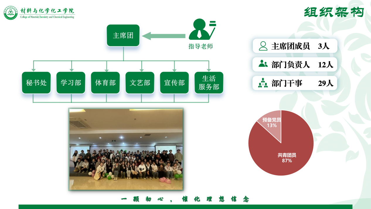 在指导老师的带领下,重庆时时彩 学生会形成“1+6(主席团+六个部门)”的组织构架,“1”为主席团,“6”分别为秘、学、体、文、宣、生六个部门。共有主席团3人,部门负责人12人,部门干事29人;除预备干事外,预备党员占比13%,其余全为共青团员。