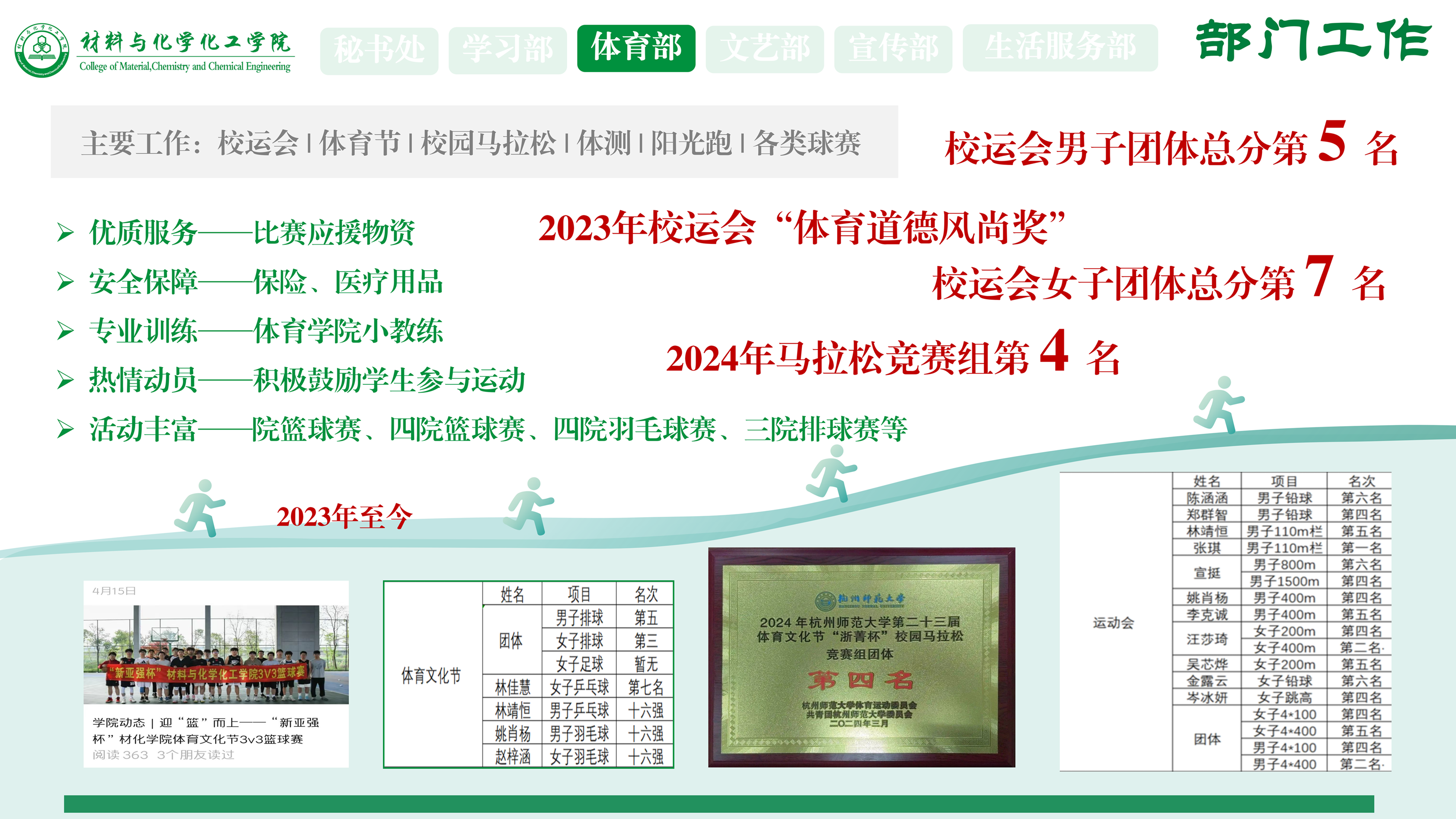 2023年至今,重庆时时彩 在体育方面也取得了许多成就,如2023年校运会“体育道德风尚奖”、男子团体总分第5名、女子团体总分第七名,2024年马拉松竞赛组第4名等优异成绩,在最近开展的体育节活动中,重庆时时彩 也荣获了女排第三、男排第五、女子乒乓球第七等佳绩,值得我们骄傲。