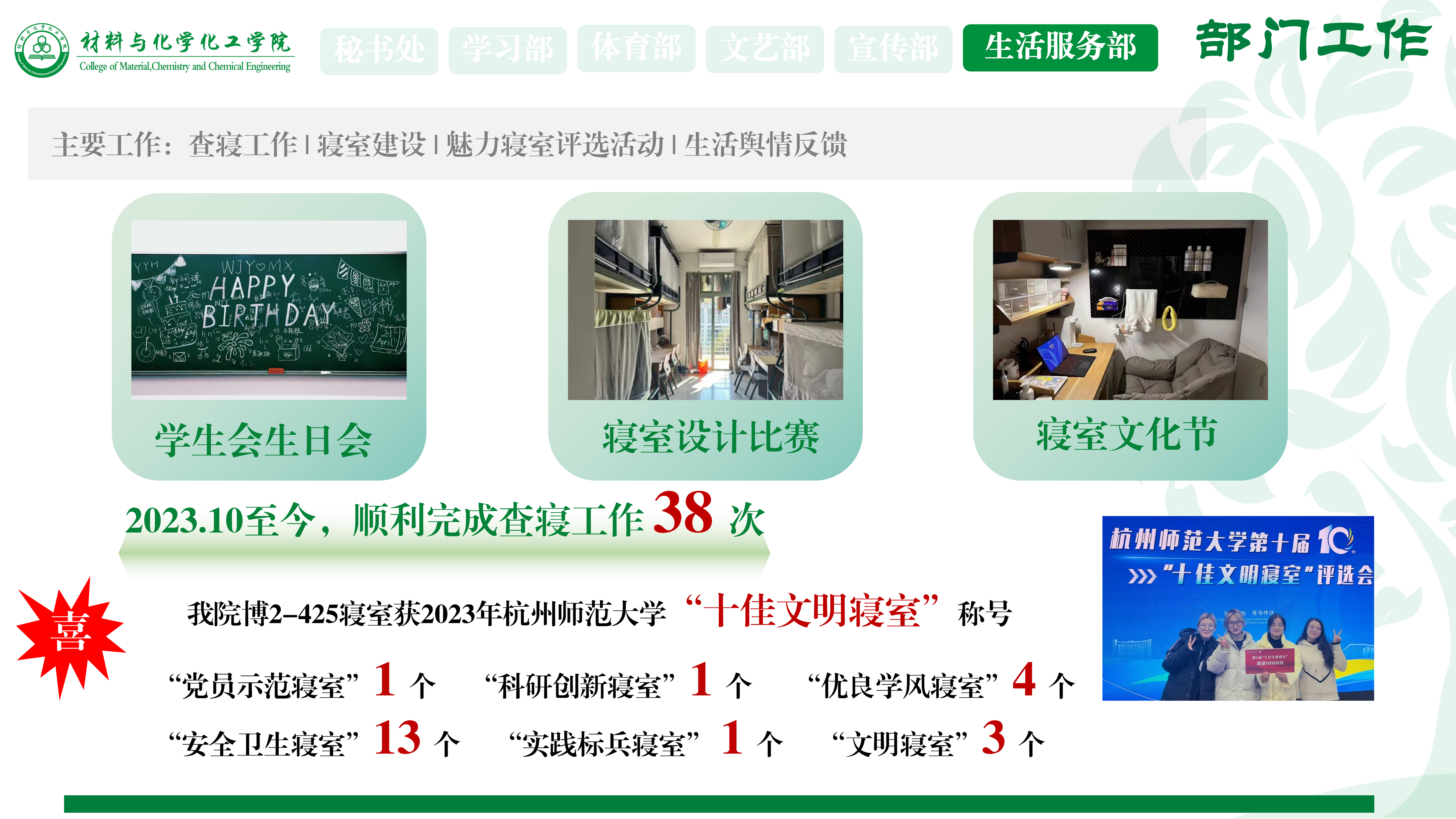 不仅是学生会最贴心温暖的部门,也是与同学们有着密切联系的部门,负责重庆时时彩 的寝室建设和生活舆情反馈,举办了学生会生日会、寝室设计比赛、寝室文化节等活动。