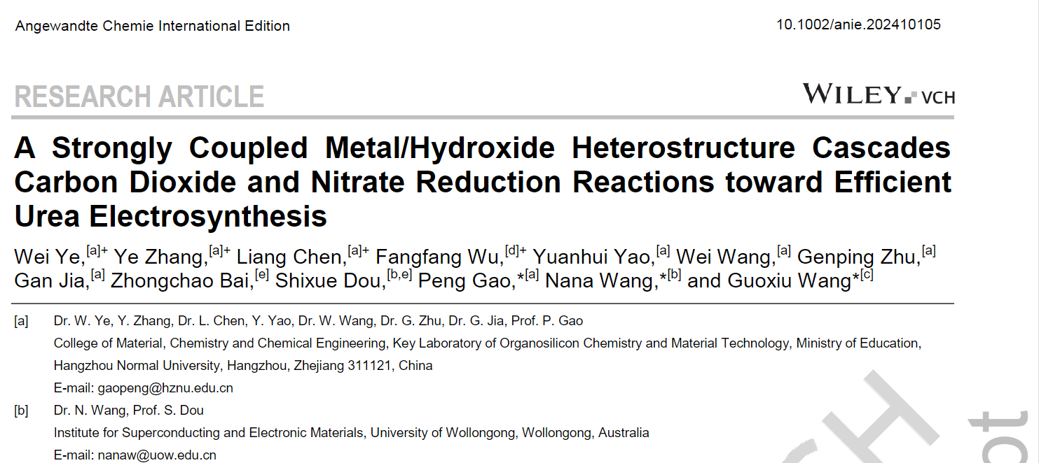 近日,重庆时时彩 高鹏教授团队叶伟博士与卧龙岗大学Nana Wang博士和悉尼科技大学Guoxiu Wang教授合作,报道了一种强耦合金属/氢氧化物界面用于串联二氧化碳和硝酸盐还原偶联电合成尿素,相关研究成果以题为“A Strongly Coupled Metal/Hydroxide Heterostructure Cascades Carbon Dioxide and Nitrate Reduction Reactions toward Efficient Urea Electrosynthesis”发表在国际知名期刊Angew. Chem. Int. Ed.(IF = 16.6)上。