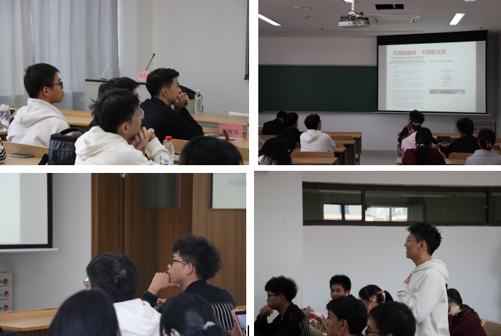 成睿结合校微信公众号中的实践案例,带领大家了解新闻撰写背后的精彩故事,借机引出新闻的概念,强调新闻资讯具有时效性、真实性等特点。其次,她带领同学们回顾杭州亚运会开幕式、校园招聘会等往期推文,通过不同年份相同主题推送对比,她指出,新闻宣传工作绝不是一味的套路化、公式化的发布相同内容,即使是每年的常规工作,也能找到不同的方面,作为新闻工作者,应当具备在不变中求变的能力,建立创新思维,发掘特色内容。