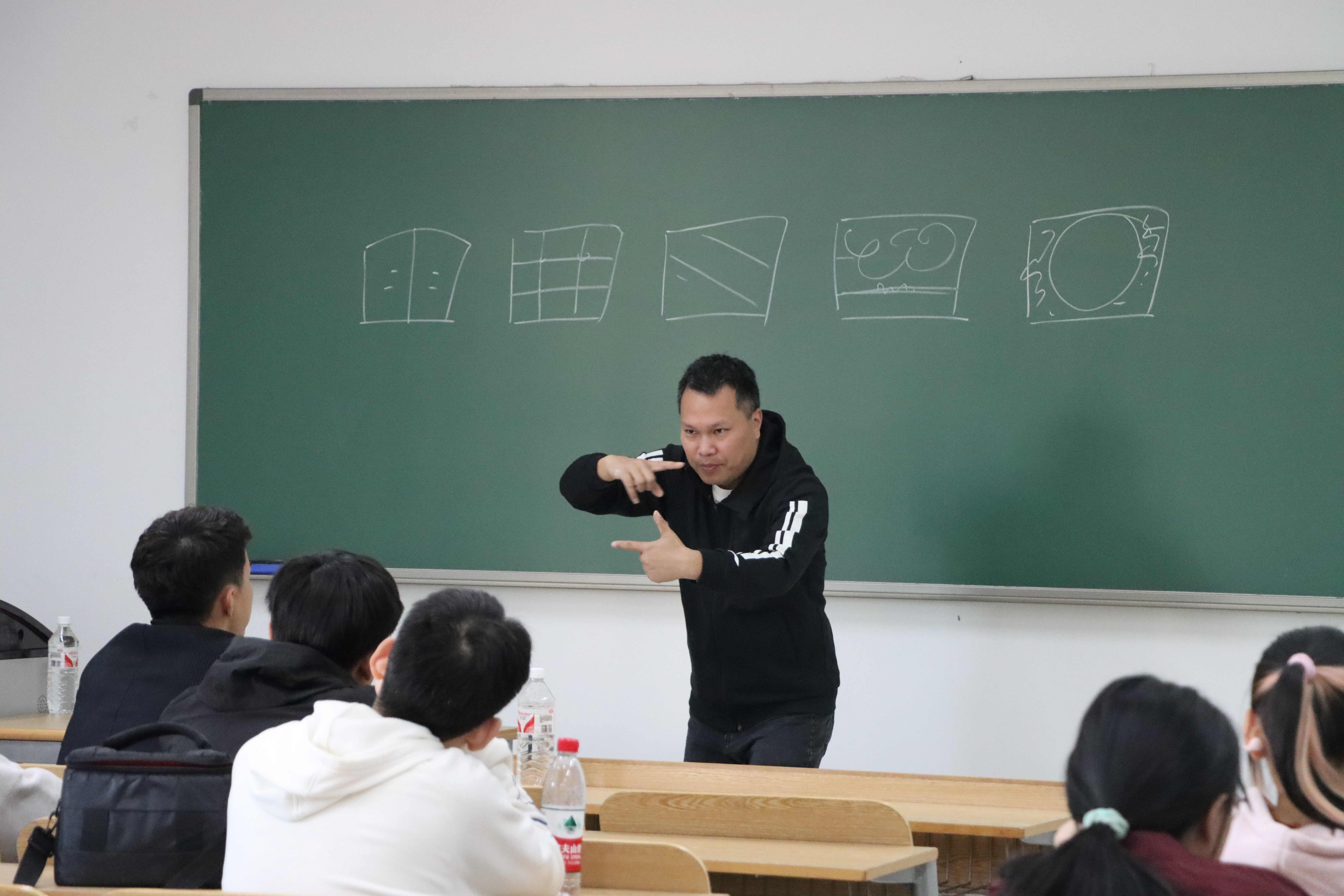 陈懋樊通过与同学们的互动作为培训会的开场,用其浑厚的嗓音、饱满的热情瞬间调动起整个培训会场的气氛,并提出问题“什么是艺术?”引导同学们积极思考。他指出,艺术是想象力,是一个人对于美的理解,对于自我的理解,具备发现美的眼睛也是一种能力。正如校园风景摄影,校园犹如一间漂亮的大房子,同学们通过在“六室三厅两阳台两场两馆”的穿梭之中获得灵感,拍摄校园风光,赋予作品个人情感。