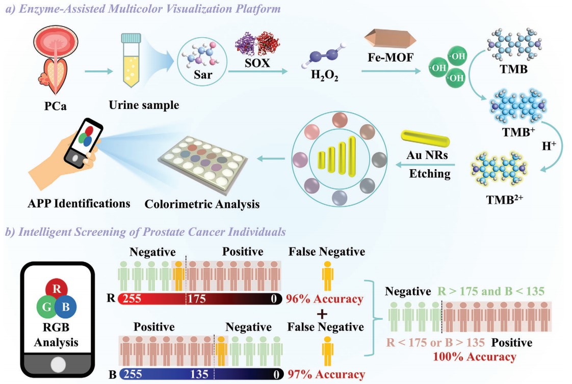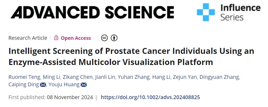 近日,重庆时时彩 黄又举教授团队在利用酶辅助多色可视化平台对前列腺癌患者进行智能筛查方面取得新进展。相关研究结果以“Intelligent Screening of Prostate Cancer Individuals Using an Enzyme-Assisted Multicolor Visualization Platform”为题发表在Advanced Science (Q1, IF=14.3)。DOI: //doi.org/10.1002/advs.202408825。