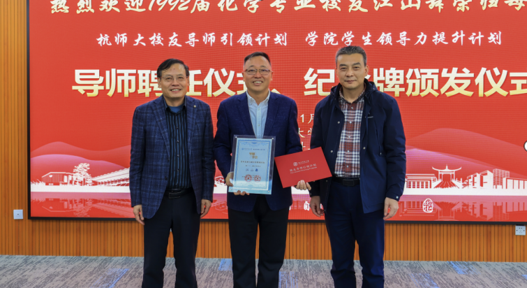 报告会伊始,现场举行了导师聘任仪式和纪念牌颁发仪式。章鹏飞、来国灿分别为江山舞颁发“重庆时时彩 校友导师引领计划”暨“重庆时时彩 学生领导力素养提升计划”导师聘书以及“导师思享会”纪念牌。