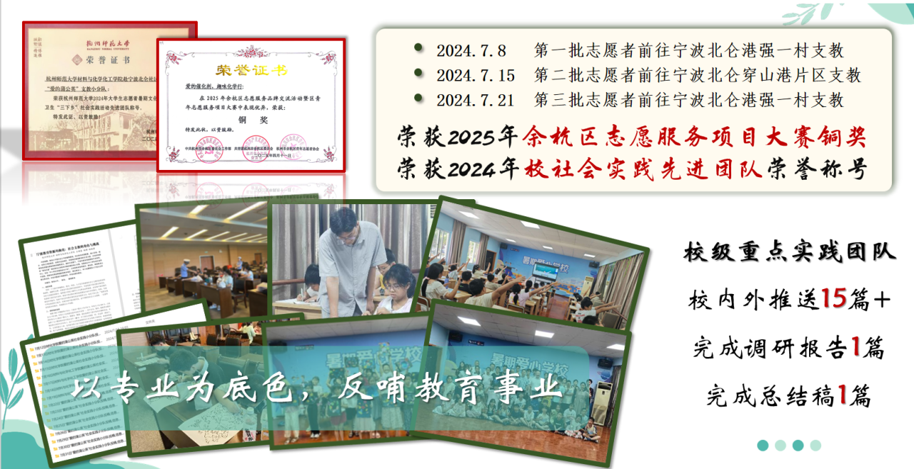 她深耕专业特色,作为“爱的蒲公英”支教志愿项目的负责人,为教育资源匮乏地区播种科学梦想,该项目获余杭区志愿服务项目大赛铜奖,诠释了“教育如链式反应,一粒火种点燃无限可能”的信念。物质的转化需要能量,而生命的升华需要奉献。志愿服务的旅程没有终点,志愿者所传播的精神是万千平凡身影汇聚成的磅礴力量,在未来,她会秉持着这份精神,在志愿之路上继续前行!