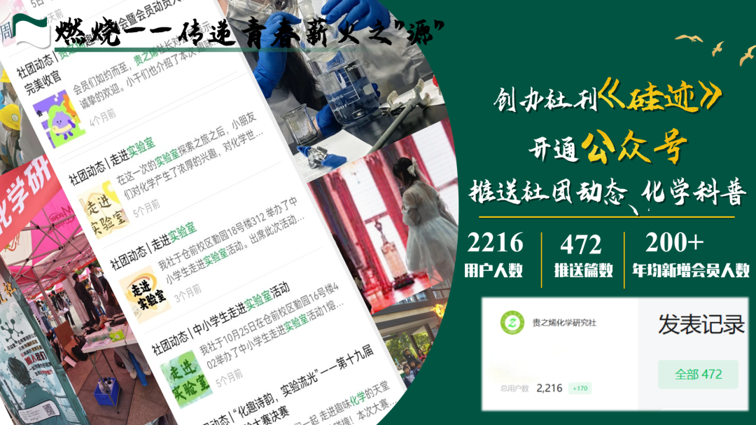 贵之烯化学研究社致力于让化学触手可及,本学年开展了星空球、手工皂等社团活动,校内外平台推送文章22篇以上,总阅读量破9000,累计吸引会员超200人。