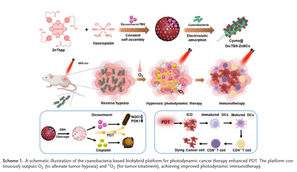 图1:蓝藻-纳米复合系统(Cyano@DicTBS-ZnNCs)的构建过程及其通过光合供氧、药物释放和光动力效应协同治疗肿瘤的作用机制。