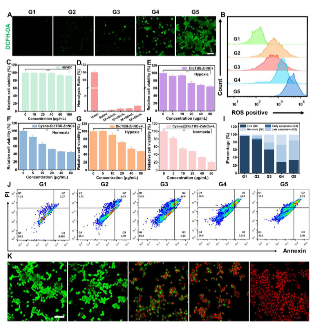 研究团队首先利用共价自组装策略构建了载药纳米颗粒DicTBS-ZnNCs,再通过静电吸附将其修饰在蓝藻表面,成功构建了活体治疗系统Cyano@DicTBS-ZnNCs。电镜观察显示纳米颗粒均匀展示在蓝藻表面,元素分析也证实了系统的成功构建。特别值得注意的是,负载后的蓝藻仍保持优异的光合活性和氧气生产能力,为后续的光动力治疗提供了充足的氧气保障。在模拟肿瘤缺氧环境的体外实验中,该系统展现出显著的治疗优势。一方面,蓝藻的光合作用有效缓解了缺氧状况;另一方面,纳米颗粒在肿瘤微环境特异性释放药物。