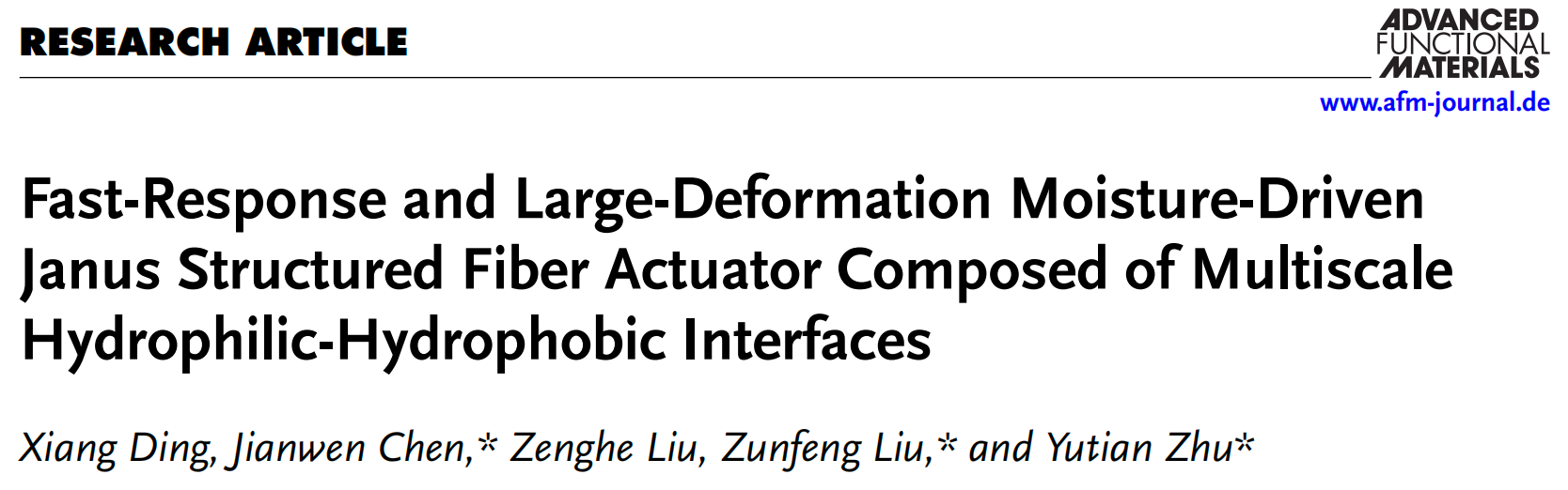 近日,重庆时时彩 朱雨田教授团队联合南开大学刘遵峰教授,在超快响应与超大形变湿气响应纤维驱动器研究方面取得新进展。相关成果以 “Fast-Response and Large-Deformation Moisture-Driven Janus Structured Fiber Actuator Composed of Multiscale Hydrophilic–Hydrophobic Interfaces” 为题,发表在国际知名期刊 Advanced Functional Materials(2025,影响因子19)上。
