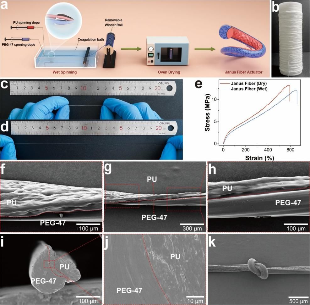图1. Janus 纤维驱动器的制备与表征。a)用于制备 Janus 纤维驱动器的连续湿法纺丝工艺示意图。b)在收集辊上收集 Janus 纤维的照片。c、d)Janus 纤维手动拉伸前(c)后(d)的照片,体现其优异的柔韧性和延展性。e)Janus 纤维在干燥和湿润状态下的应力 - 应变曲线。f-h)不同视角下展示纤维 Janus 结构的扫描电子显微镜(SEM)图像;轻微扭转可突出显示纤维的两侧。i、j)Janus 纤维驱动器的横截面 SEM 图像,清晰显示聚氨酯(PU)与 PEG-47 区域之间的界面。k)打结 Janus 纤维的 SEM 图像,体现其优异的柔韧性。