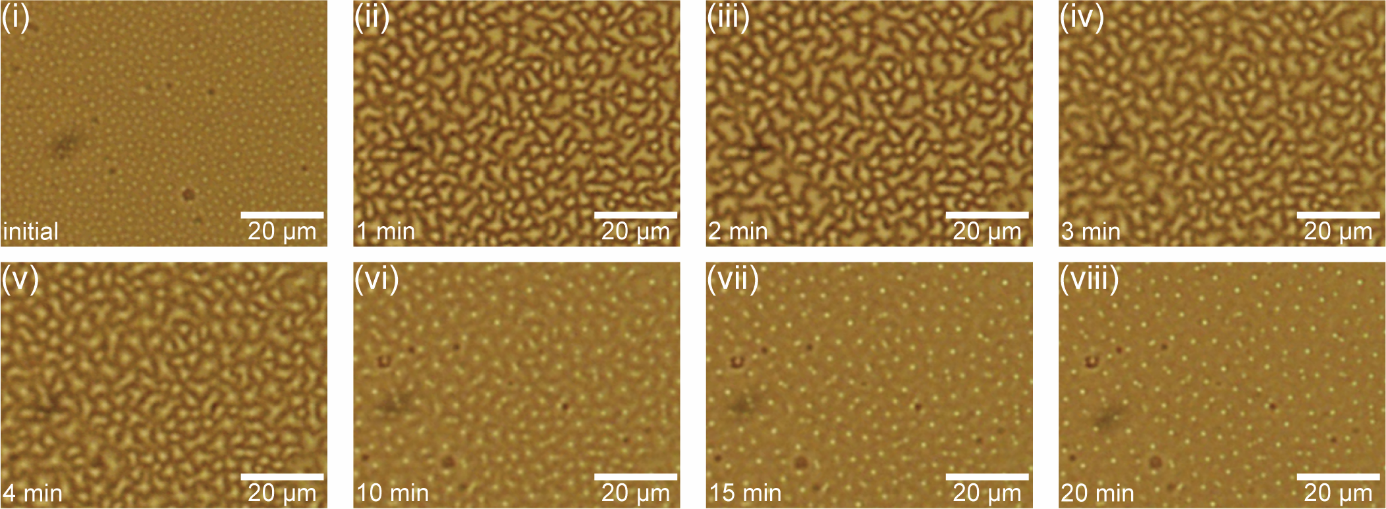 图2. 旋涂法制备的PEG-47薄膜受到湿气刺激后岛相随时间(初始状态、1 分钟、2 分钟、3 分钟、4 分钟、10 分钟、15 分钟、20 分钟;从左至右、从上至下)的形貌演变过程。