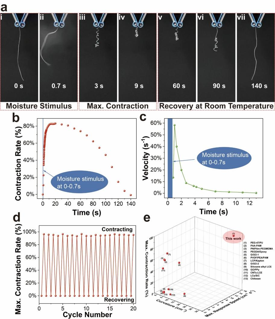 图3. Janus 纤维驱动器的湿度驱动性能。a)照片展示了 Janus 纤维驱动器在湿度环境中暴露 0.7 秒后的收缩过程(i-iv),以及随后在室温下的持续收缩与恢复行为(v-vii)。b)a 图所示收缩与恢复过程中,Janus 纤维驱动器的收缩率随时间变化曲线。c)a 图所示收缩与恢复过程中,Janus 纤维驱动器的速度随时间变化曲线。d)Janus 纤维驱动器的循环性能:经过 20 次湿度驱动收缩-干燥恢复循环后,其最大收缩率的保持情况。e)该 Janus 纤维驱动器与文献中已报道的湿度驱动纤维驱动器在曲率、最大响应速度及最大收缩率方面的性能对比。