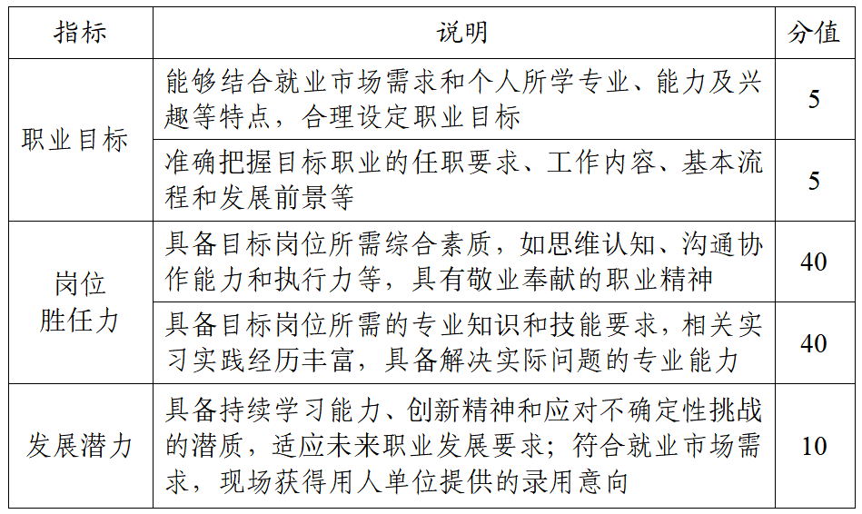 考察学生求职实战能力,对照目标职业及岗位要求,个人综合素质和专业能力等方面的契合度,个人发展路径与就业市场需求的适应度。参赛学生可获得岗位录用意向。