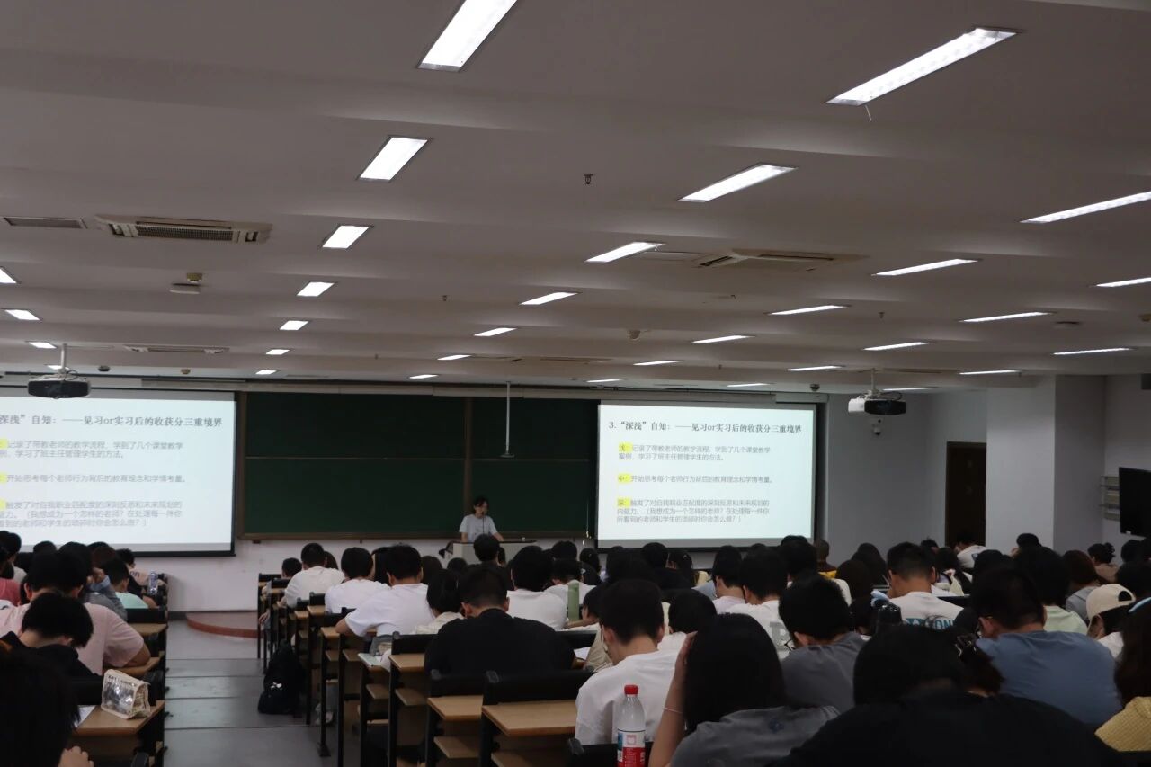 汪老师还从教学、教研、管理、沟通、评价、服务等多方工作维度,结合她在一线教学的实际情况,通过生动的案例讲解让同学们深刻认识到:一名合格的化学教师恰似一名“六边形战士”,不仅要精于学科教学,更要在班级管理、家校沟通、教育服务等多领域躬身践行,以多元角色助力学生成长。