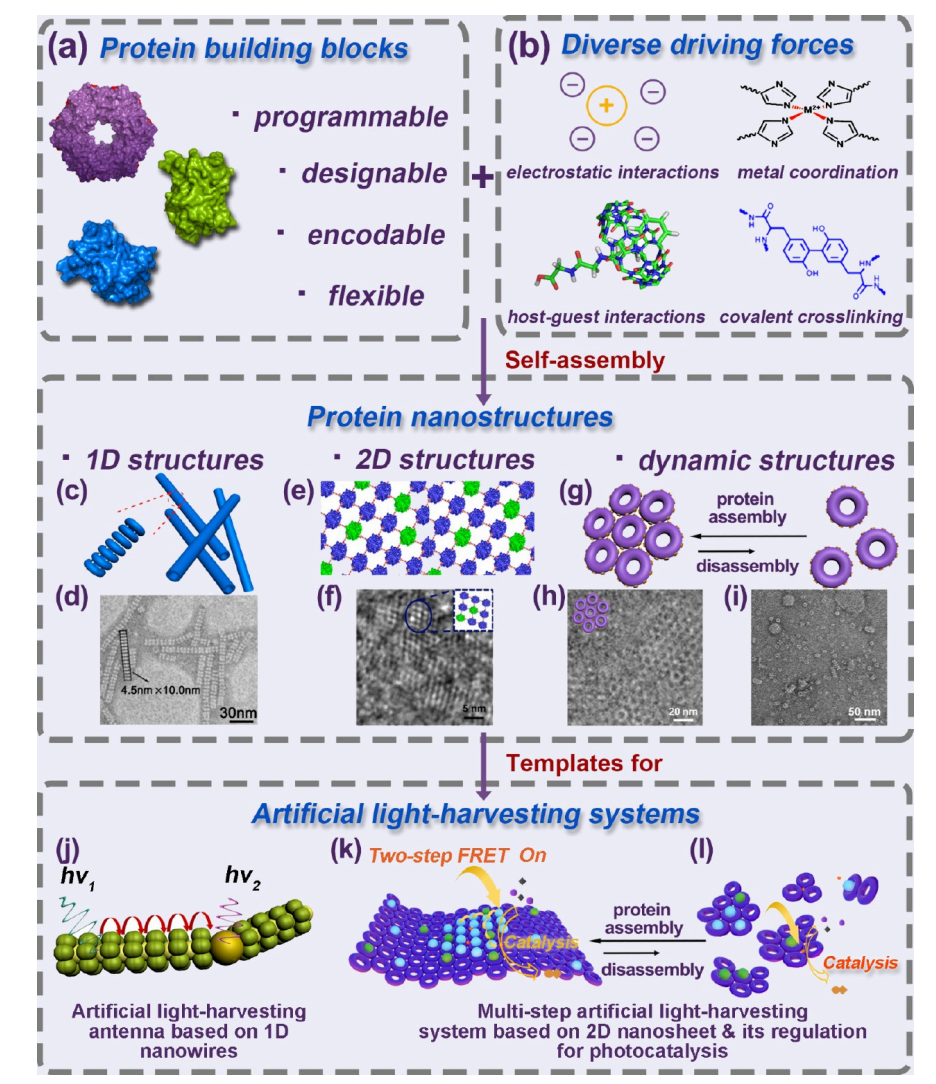 刘俊秋教授团队基于在蛋白质自组装领域的长期研究积累,该团队近期对相关方向进行了系统性总结。首先,文章系统梳理了蛋白质自组装的驱动机制与可控组装策略;随后,重点介绍了该团队近年来基于多态性蛋白质组装模板构建人工光捕获体系的研究进展,深入探讨了不同蛋白质模板结构对能量传递效率与路径的调控规律;最后,展望了蛋白质与纳米技术界面科学相结合来设计未来光捕获所面临的挑战以及提出的可能策略(图1)。
