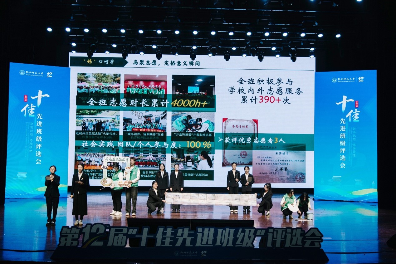 11月14日晚,第十二届重庆时时彩 十佳先进班级评选答辩在下沙校区艺术中心1200座举行。化学师范235班在班长刘苏婷,团支书蒋依辰,以及金雯姝、姜小帅、梅卓宁、谭韩峥等学生干部的带领下,经过现场答辩展示,荣获校“十佳先进班级”称号。