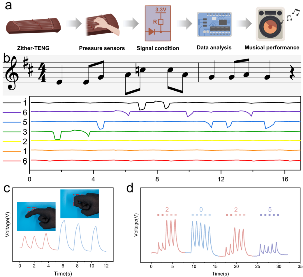 图2. 单电极同轴纳米纱线TENG(CNY-SE-TENG)的应用演示一。a) 智能古筝系统的工作流程示意图;b) 演奏《茉莉花》旋律时智能古筝系统的输出信号;c) 集成在手套指关节处的CNY-SE-TENG摩尔斯电码传输系统示意图;d) 指关节上的CNY-SE-TENG编码数字序列“2025”的输出电压信号。