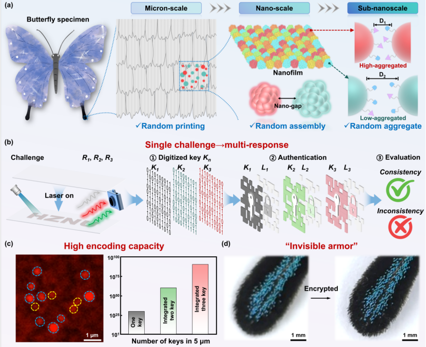 图1. OPUFs标签的跨尺度(亚纳米、纳米及微米)结构设计与防伪原理。