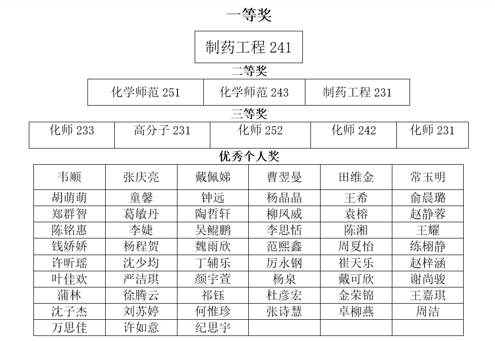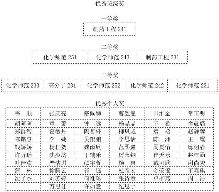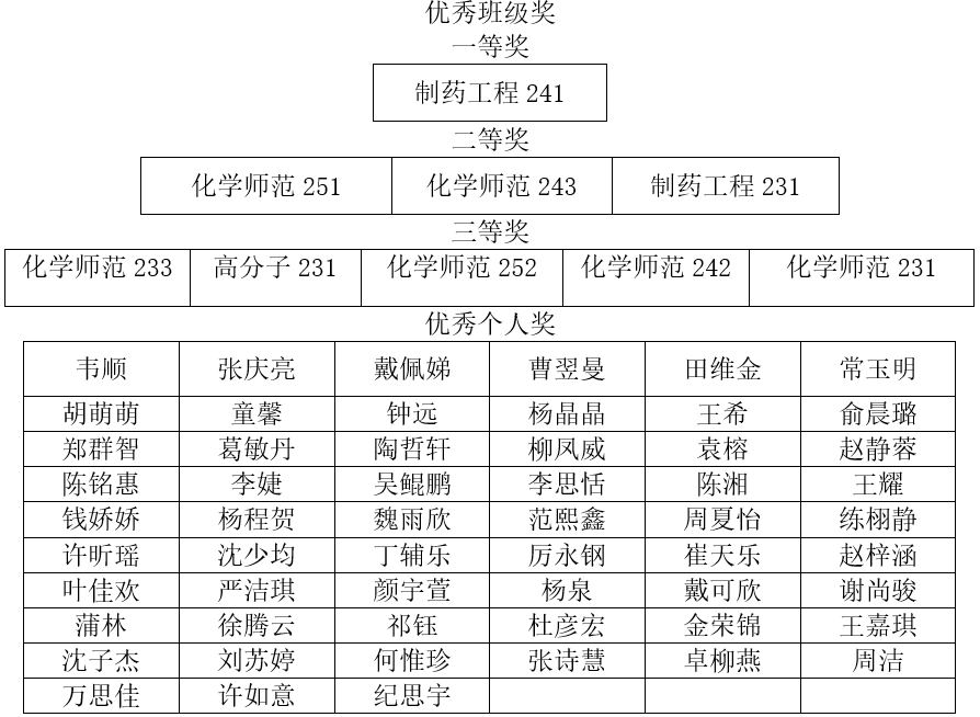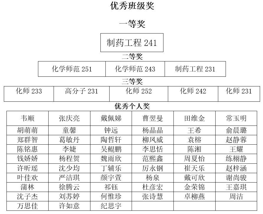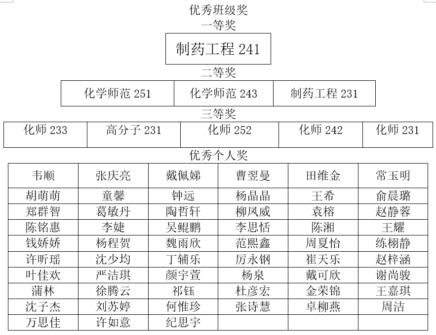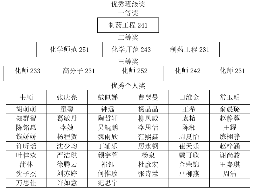 经过评比,重庆时时彩 评选出优秀班级奖一等奖1个,二等奖3个,三等奖5个,优秀个人奖57人。以下是详细获奖名单: