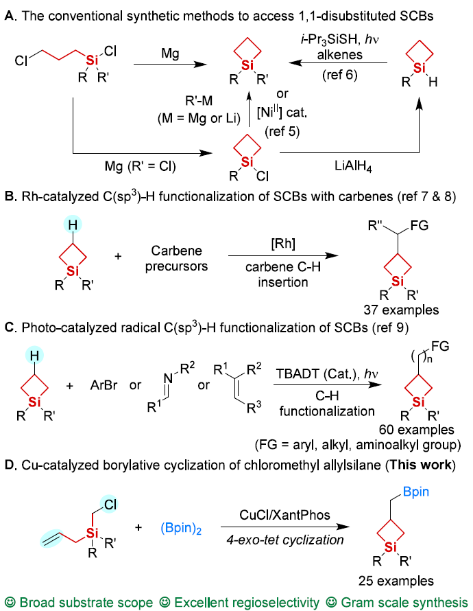 硅杂环丁烷(SCBs)作为有机硅化学领域的重要合成子,凭借其独特的环张力与可调路易斯酸性,在构建复杂有机硅骨架中占据关键地位。然而,传统合成方法依赖对水敏感的格氏试剂或锂试剂,且难以实现β位精准官能化,极大限制了其结构多样性与应用范围。近日,该徐利文/徐征/叶飞研究团队开发出一种新颖的铜催化硼化环化策略,为β-硼甲基取代硅杂环丁烷的高效合成提供了全新方案。